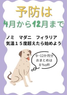 2026 3/08 春の予防 開始しました! 2026.03.08 院長 ブログ 気温15度を超えると寄生虫の予防開始サインです。 4月からの予防をおすすめします。 シーズンおまとめで割引となります。 フィラリア検査と同時に健康診断もできます。